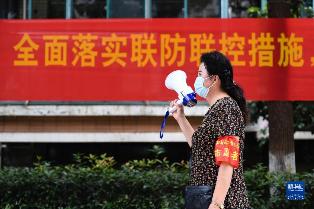 8月10日,在南京市建邺区南苑街道吉庆家园小区,志愿者马维珍提示下楼活动的居民不要聚集扎堆。新华社记者 季春鹏 摄