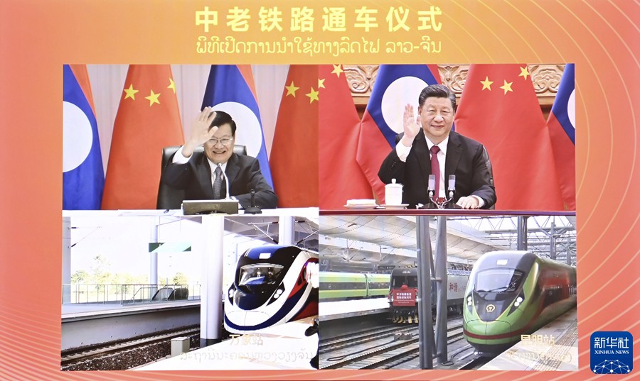 12月3日下午,中共中央总书记、国家主席习近平在北京同老挝人民革命党中央总书记、国家主席通伦通过视频连线共同出席中老铁路通车仪式。 新华社记者 黄敬文 摄