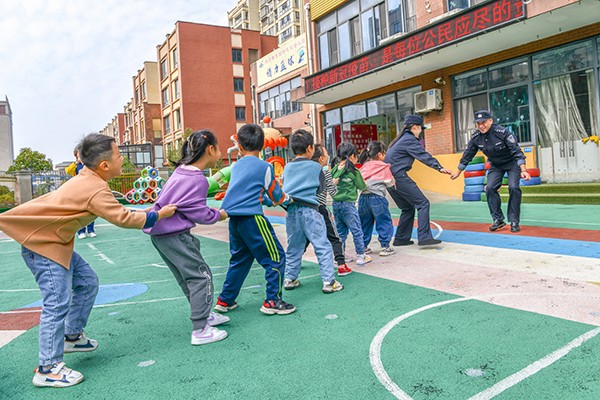 近年来,公安机关已选派30余万名业务能力强、经验丰富的公安民警兼任法治副校长,深入学校组织开展形式多样的安全教育活动。图为安徽省泾县公安局开发区派出所民警开展法治副校长进校园活动。 潘涯磊 摄