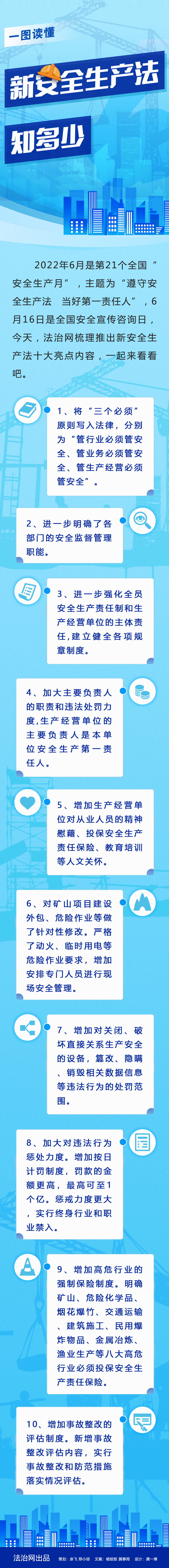 2022年6月是第21个全国“安全生产月”,主题为“遵守安全生产法 当好第一责任人”,想必各位小伙伴肯定非常关注安全生产知识。今天,值此全国安全宣传咨询日到来之际,法治网制作推出《一图读懂!新安全生产法知多少》图解海报,为大家梳理新安全生产法十大亮点内容,奏响安全生产的法治之声。动动手指,我们一起来看一看吧。