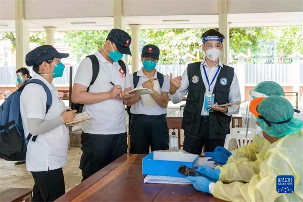 2021年5月7日,中国政府医疗专家组在老挝首都万象考察一个新冠病毒采样点,了解采样流程、信息采集、密切接触者判定标准和环境消毒等情况。新华社发(中国政府医疗专家组供图)