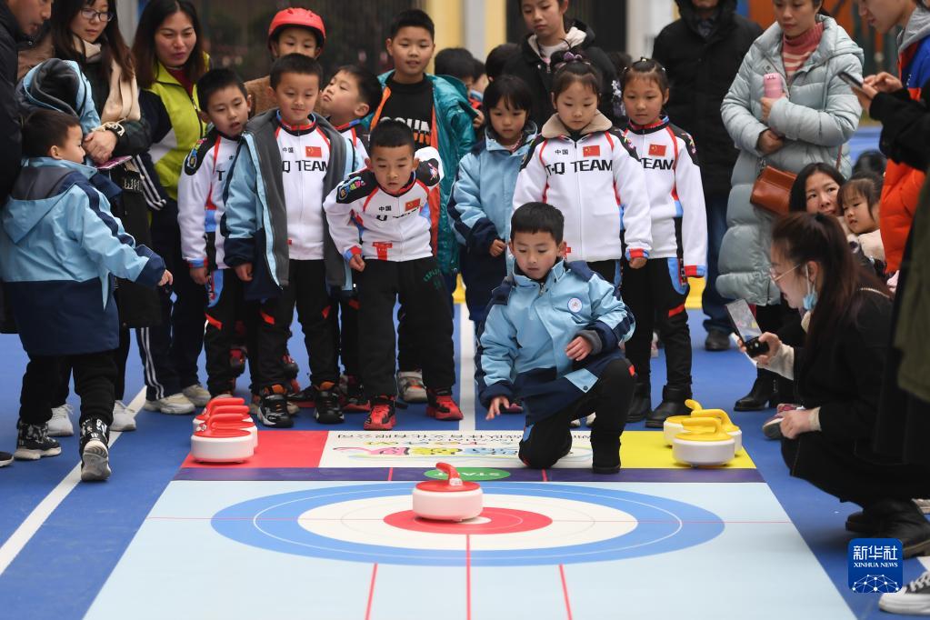 湖南省长沙市长塘里崇德小学学生在课后体验旱地冰壶运动(2022年1月7日摄)。新华社记者 薛宇舸 摄
