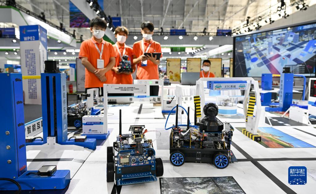 在天津举行的世界职业技术教育发展大会首届世界职业院校技能大赛上,参赛选手在实训沙盘前操作机器人设备(2022年8月20日摄)。新华社记者 孙凡越 摄