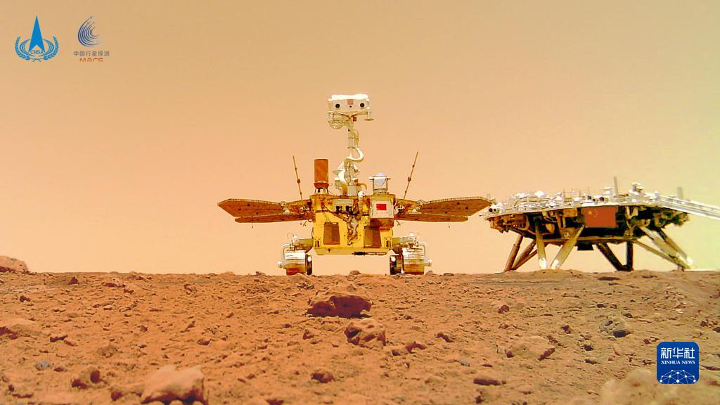 这是“着巡合影”图。2021年6月11日,国家航天局在北京举行天问一号探测器着陆火星首批科学影像图揭幕仪式,公布了由祝融号火星车拍摄的着陆点全景、火星地形地貌、“中国印迹”和“着巡合影”等影像图。首批科学影像图的发布,标志着我国首次火星探测任务取得圆满成功。 新华社发(国家航天局供图)