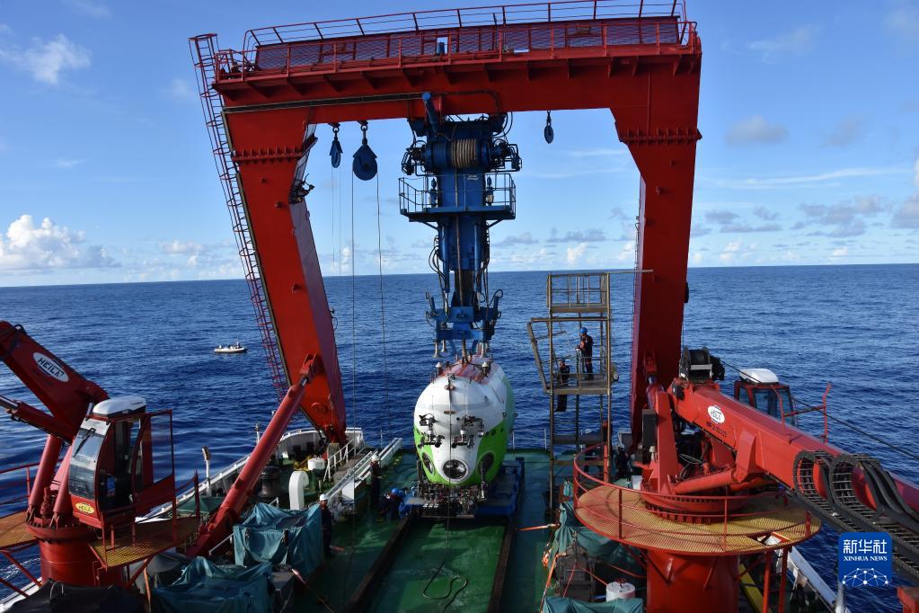 2021年8月18日,工作人员在西太平洋准备从“探索一号”科考船甲板布放“奋斗者”号。 新华社记者 陈凯姿 摄