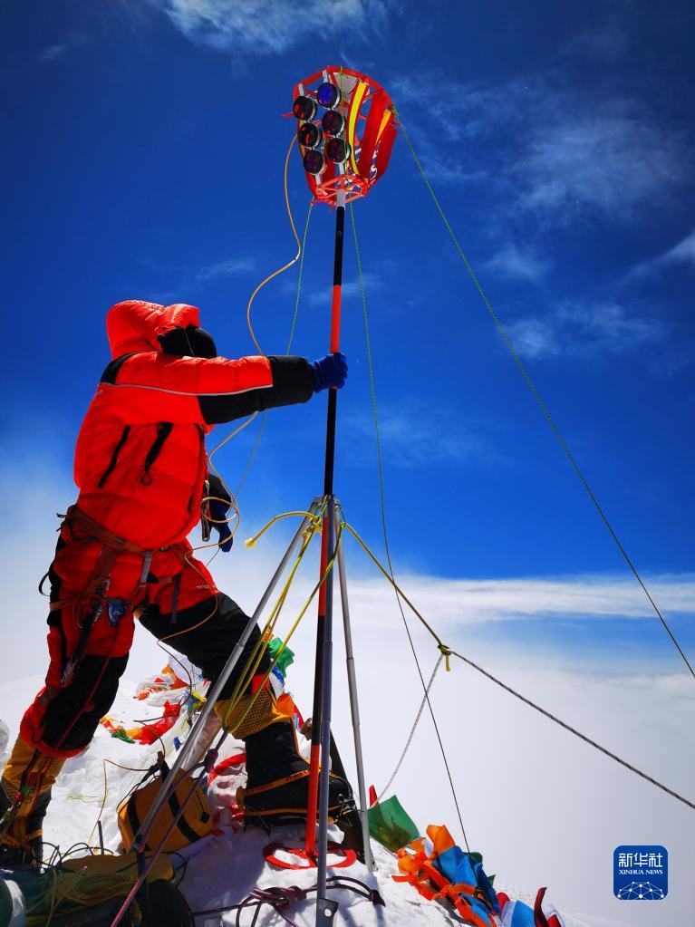 2020珠峰高程测量登山队队员在珠穆朗玛峰峰顶开展测量工作(2020年5月27日摄)。新华社特约记者 扎西次仁 摄