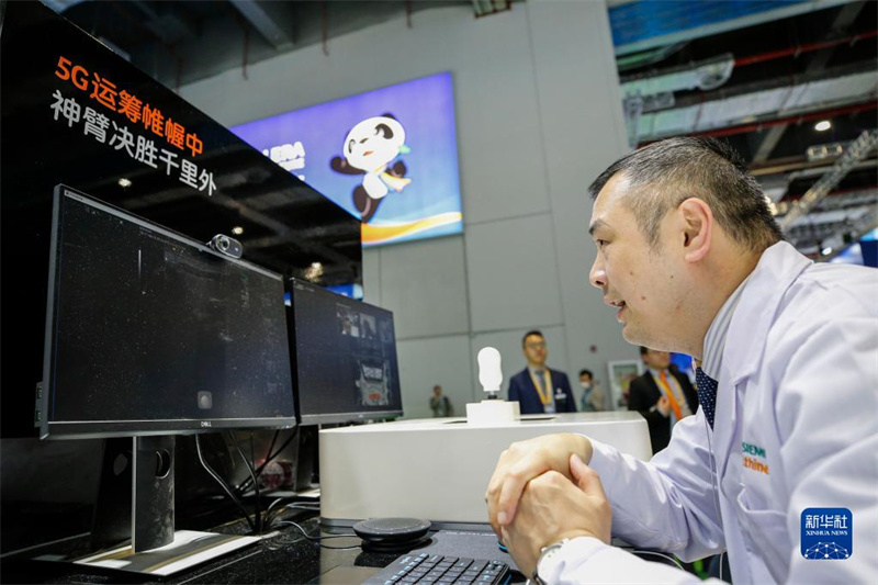 一位超声科医生在第二届中国国际进口博览会上使用西门子5G医疗远程超声解决方案,与重庆市彭水苗族土家族自治县绍庆街道社区卫生服务中心的超声医生进行远程实时高清超声图像传输和音视频对话(2019年11月6日摄)。新华社记者 张玉薇 摄