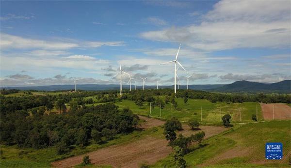 这是2022年10月4日在泰国猜也蓬府拍摄的由中国金风科技提供的风力发电机(无人机照片)。新华社发(塔纳摄)