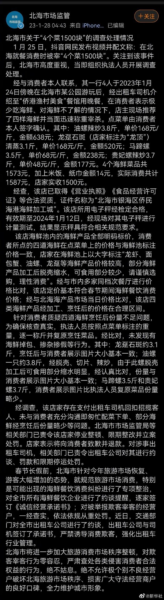 1月28日,广西北海市场监管部门通报关于“4个菜1500块”的调查处理情况。据通报,经调查,该店家存在支付出租车司机回扣招揽客人、未与消费者充分沟通即匆忙配菜下单、部分海鲜经烹饪后份量略少等问题。北海市市场监管局等相关部门已责令该店家停业整顿、限期整改并立案处罚。(记者:朱丽莉 陈露缘)