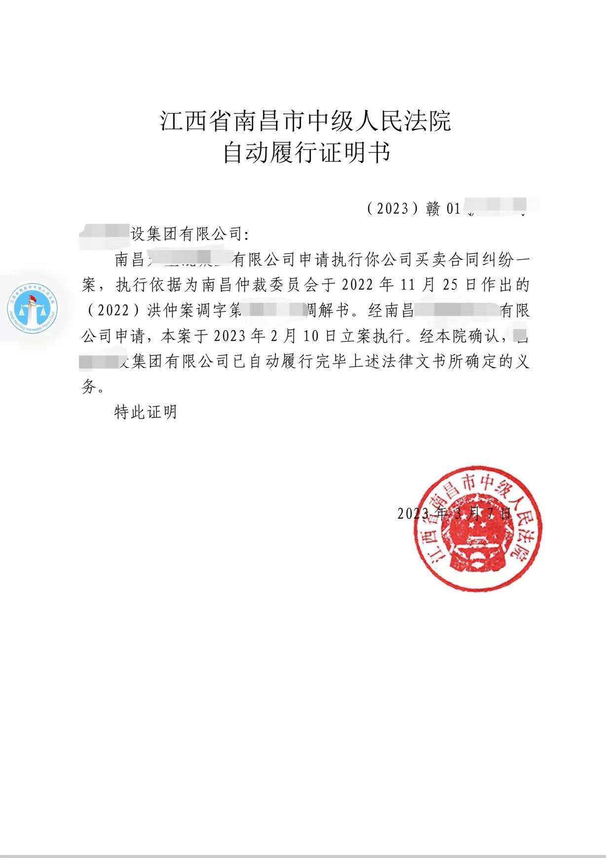 执行立案后,该建设公司通过“诉事速办”通道第一时间联系上执行法官,向法官陈述公司目前面临的困难,表达了履行义务的意愿。执行法官了解情况后,便进一步向其释明了江西省南昌市中级人民法院为褒奖诚信,推动被执行人自动履行,已建立了自动履行机制。被执行人自动履行完义务的,由法院出具“自动履行证明书”为其诚信行为背书。坚定被执行人自动履行的意愿后,执行法官主动联系申请执行人,组织双方进行调解,促使双方达成了执行和解协议。被执行人如期自动履行完义务后,如愿收到了法院出具的“自动履行证明书”。