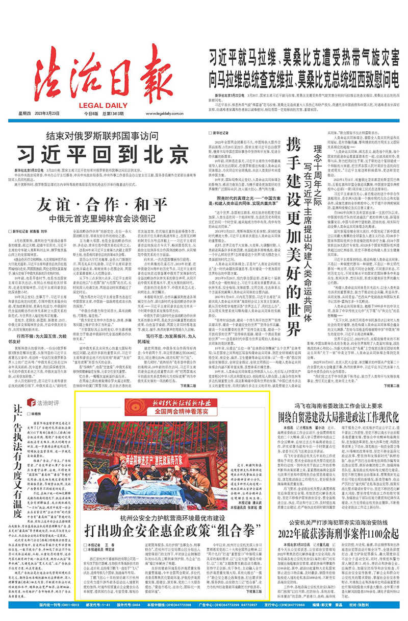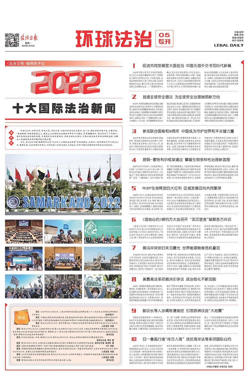 全年推出89块“环球法治”专刊,刊发《中国不断深化与各国禁毒领域全方位合作》《中国“三大倡议”引领全球人权治理》等一大批稿件,向世界更好展示法治中国形象。做好2023北京文化论坛、第八届中国成都国际非物质文化遗产节等宣传报道,积极展示我国文化建设成果,持续提升中华文化影响力。