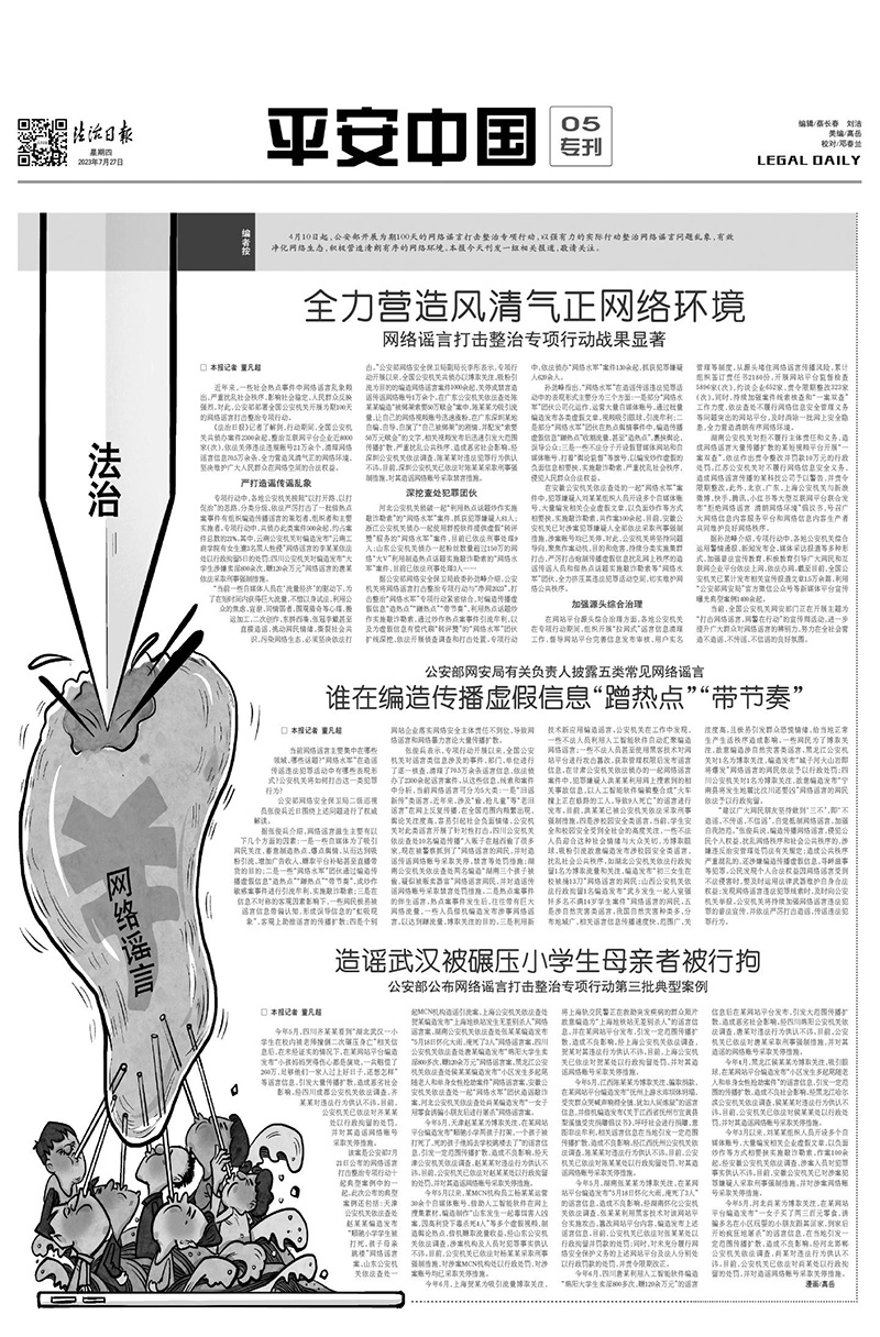充分发挥平安中国专刊优势,集中报道政法机关在保护青少年、守护绿水青山、整治网络乱象、基层社会治理创新、严厉打击各类违法犯罪活动方面所作的积极努力
