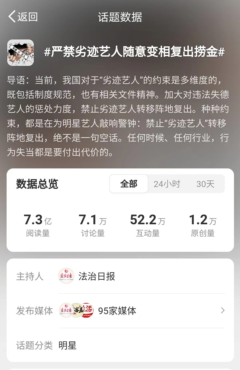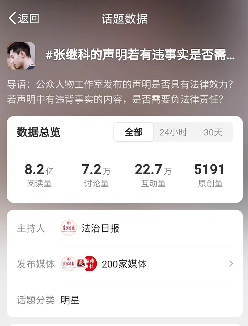 #张继科的声明若有违事实是否需要担责##严禁劣迹艺人随意变相复出捞金#两个话题阅读量分别达到8.2亿次、7.3亿次