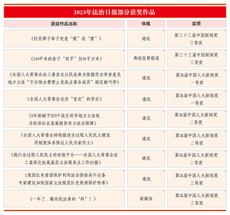 2023年,报社2件作品获得第三十三届中国新闻奖三等奖,7件作品分获第31届中国人大新闻奖一、二、三等奖,1个专题获评“2023中国正能量网络精品”,1件作品获得第十八届全国法治动漫微视频作品征集活动三等奖;3个党支部被中央和国家机关工委评为“四强”党支部。