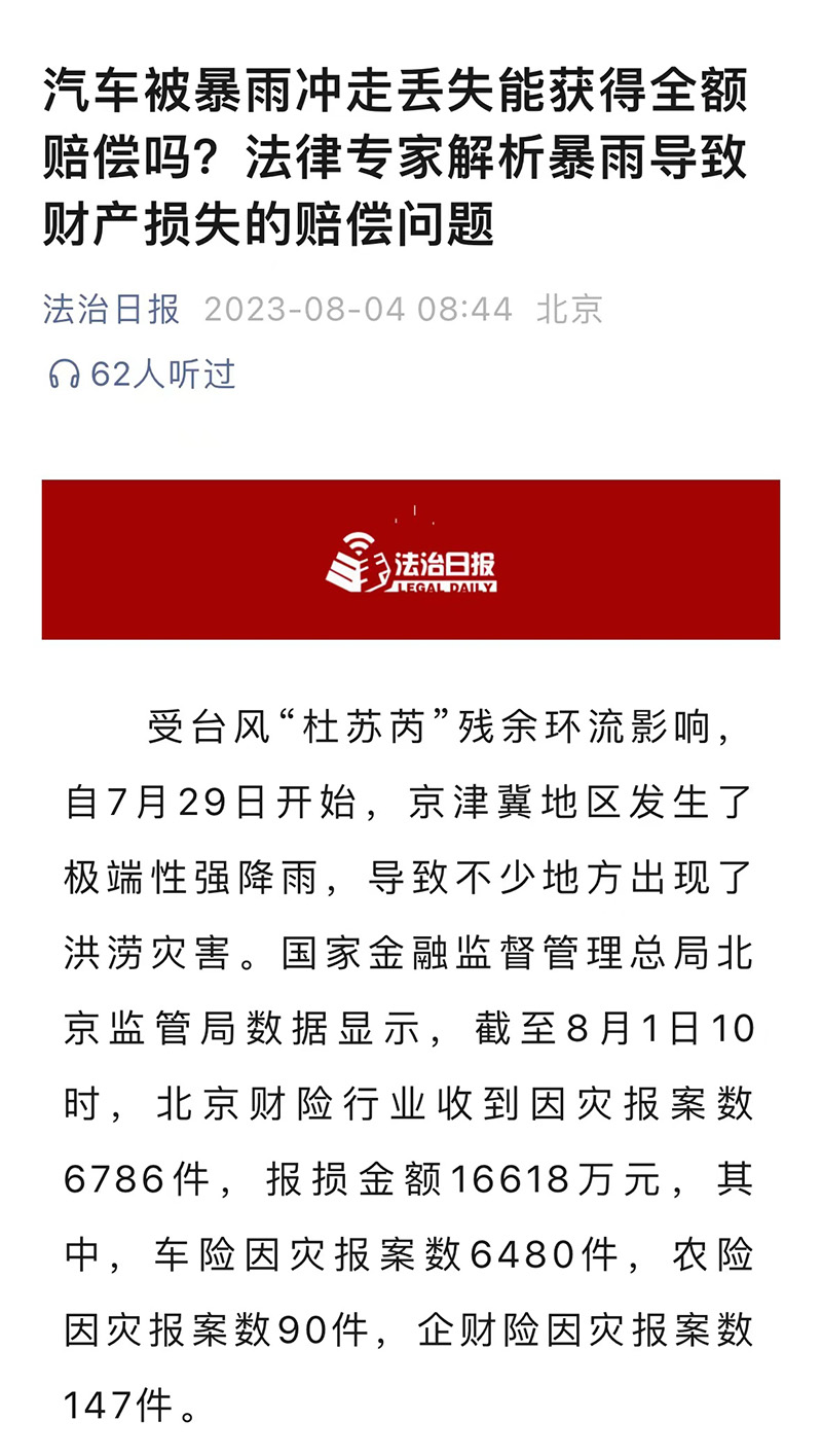 《汽车被暴雨冲走丢失能获得全额赔偿吗?法律专家解析暴雨导致财产损失的赔偿问题》一稿及时解惑普法,阅读量迅速突破10万+