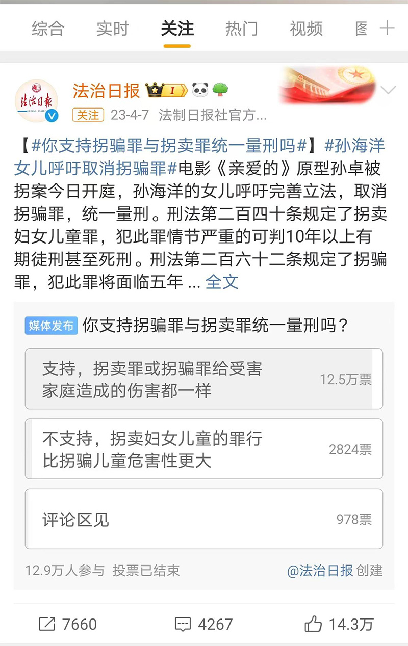 关注孙卓被拐案,推出微博话题#你支持拐骗罪与拐卖罪统一量刑吗#并发起投票,普及两种罪名区别,引导网友理性参与讨论。本次投票活动被新浪评为兼具专业性与话题度的优质投票,列入优质投票案例在微博平台展示