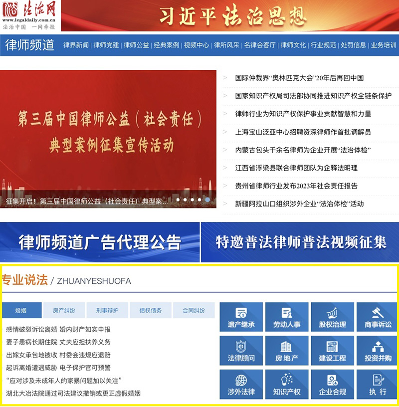 法治网“律师”频道开设17个与大众生产生活密切相关的栏目,邀请律师撰写普法文章解答网友法律问题