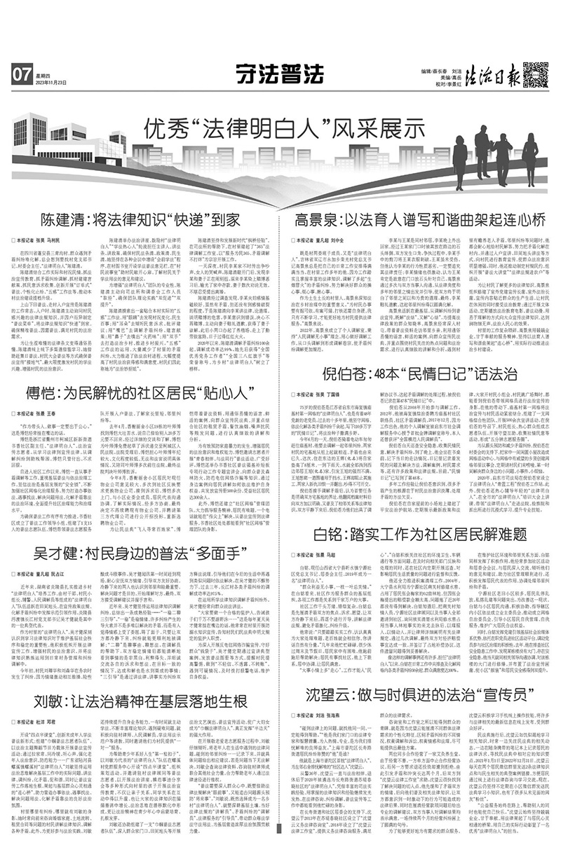 将更多笔墨对准基层一线,推出一系列有态度、有温度、有力度、有深度的新闻报道。《法治日报》用3个专版集中展示优秀“法律明白人”扎根基层、助力社会治理的生动故事。《法治日报·社区版》全年共推出52块“平安中国·身影”版,展现170余名基层法治工作者的坚持、付出与担当。