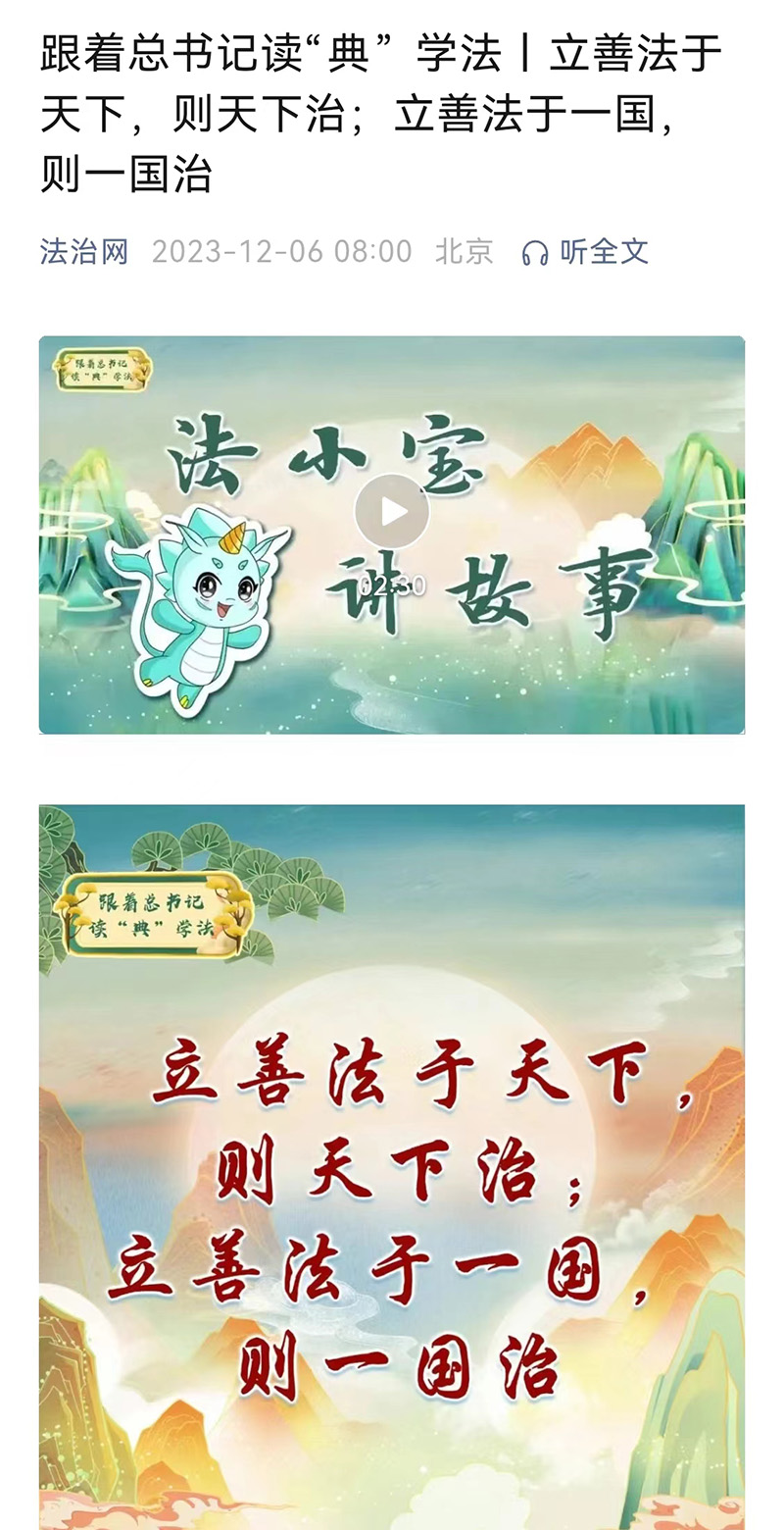 为进一步强化习近平法治思想宣传阐释,对法治网“习近平法治思想”频道进行全面改版;继续推出“跟着总书记读‘典’学法”系列融媒体产品,深入宣传习近平法治思想,传承中华优秀传统法律文化;全年制作992期《法治金句》节目,被学习强国APP在首页和“法治中国”“听法律”两个频道同步推送。