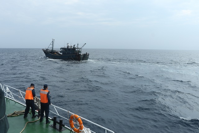 图为海警执法员对嫌疑船舶喊话亮明执法身份