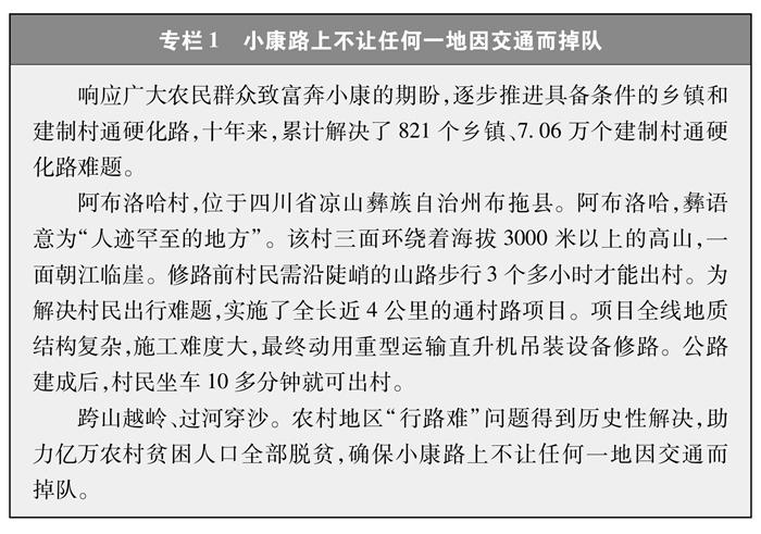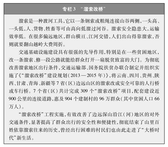 解决特殊地区出行难题。改一条溜索、修一段公路就能给群众打开一扇脱贫致富的大门。为了保障偏远山区百姓安全出行,推动“溜索改桥”建设,专项资金支持、精心组织实施,用3年时间彻底改善了溜索地区出行条件(专栏3)。推进“直过民族”③和人口较少民族聚居区农村公路建设,解决民族地区交通闭塞的突出问题,加快民族地区脱贫致富步伐。