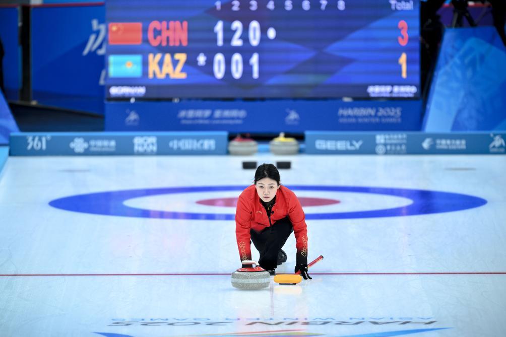 2月4日,中国队选手韩雨在比赛中掷壶。新华社记者 江汉 摄