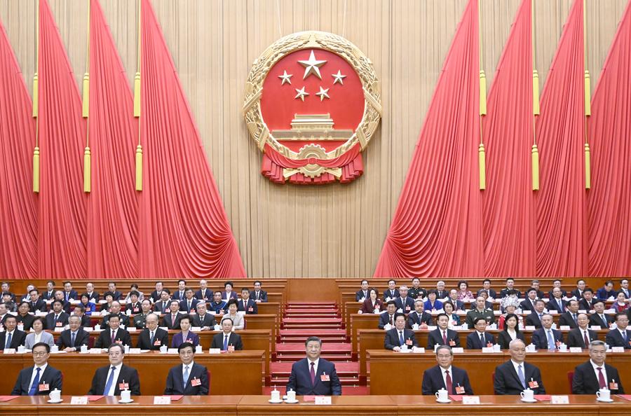 3月11日下午,第十四届全国人民代表大会第三次会议在北京人民大会堂闭幕。党和国家领导人习近平、李强、王沪宁、蔡奇、丁薛祥、李希、韩正等在主席台就座。新华社记者 李学仁 摄