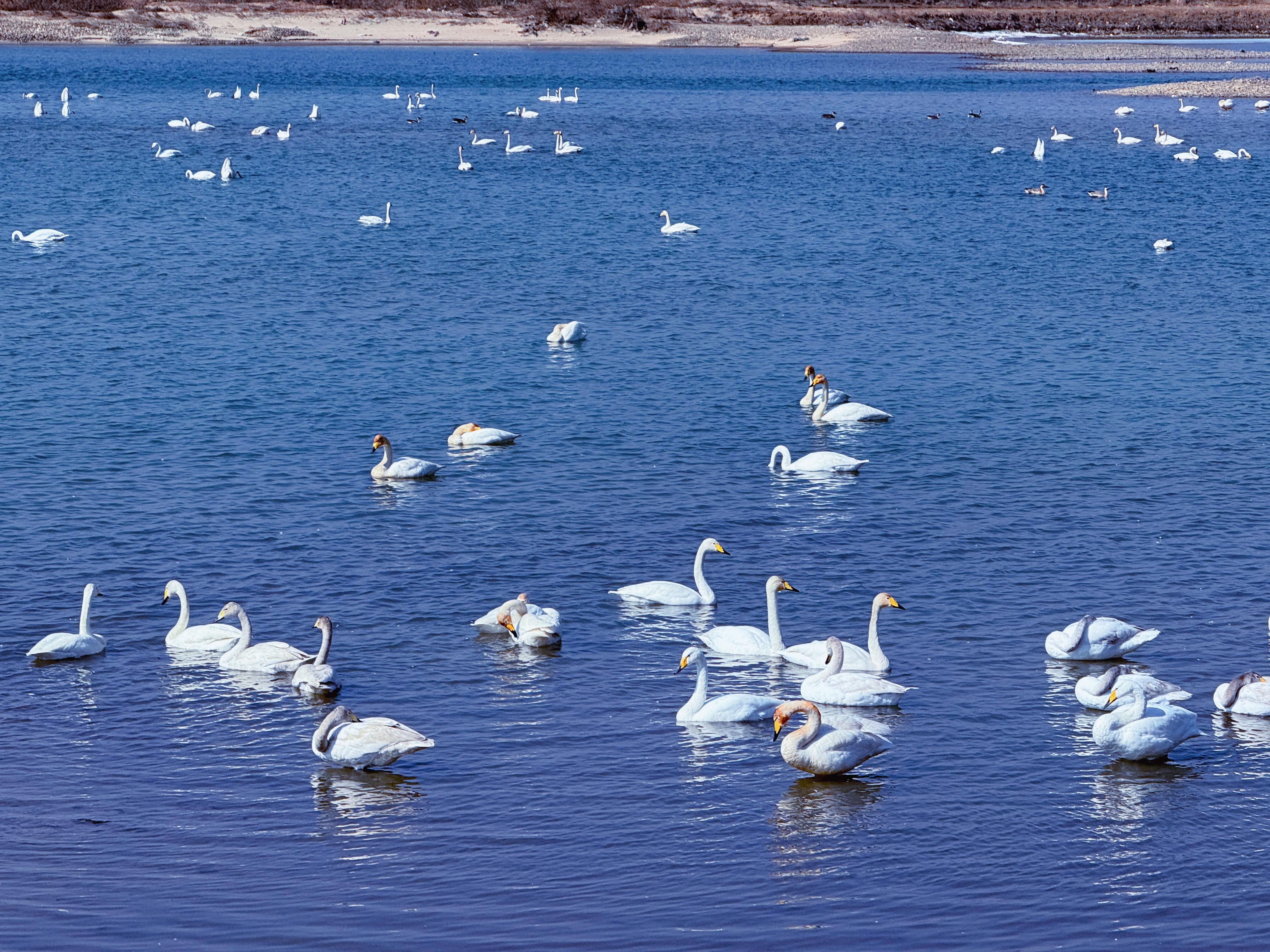 近日,有大批野生天鹅及白鹭、灰鹭、野雁等珍贵鸟类翩然至辽宁省丹东市凤城市蓝旗镇新发村大洋河水域候鸟栖息地。