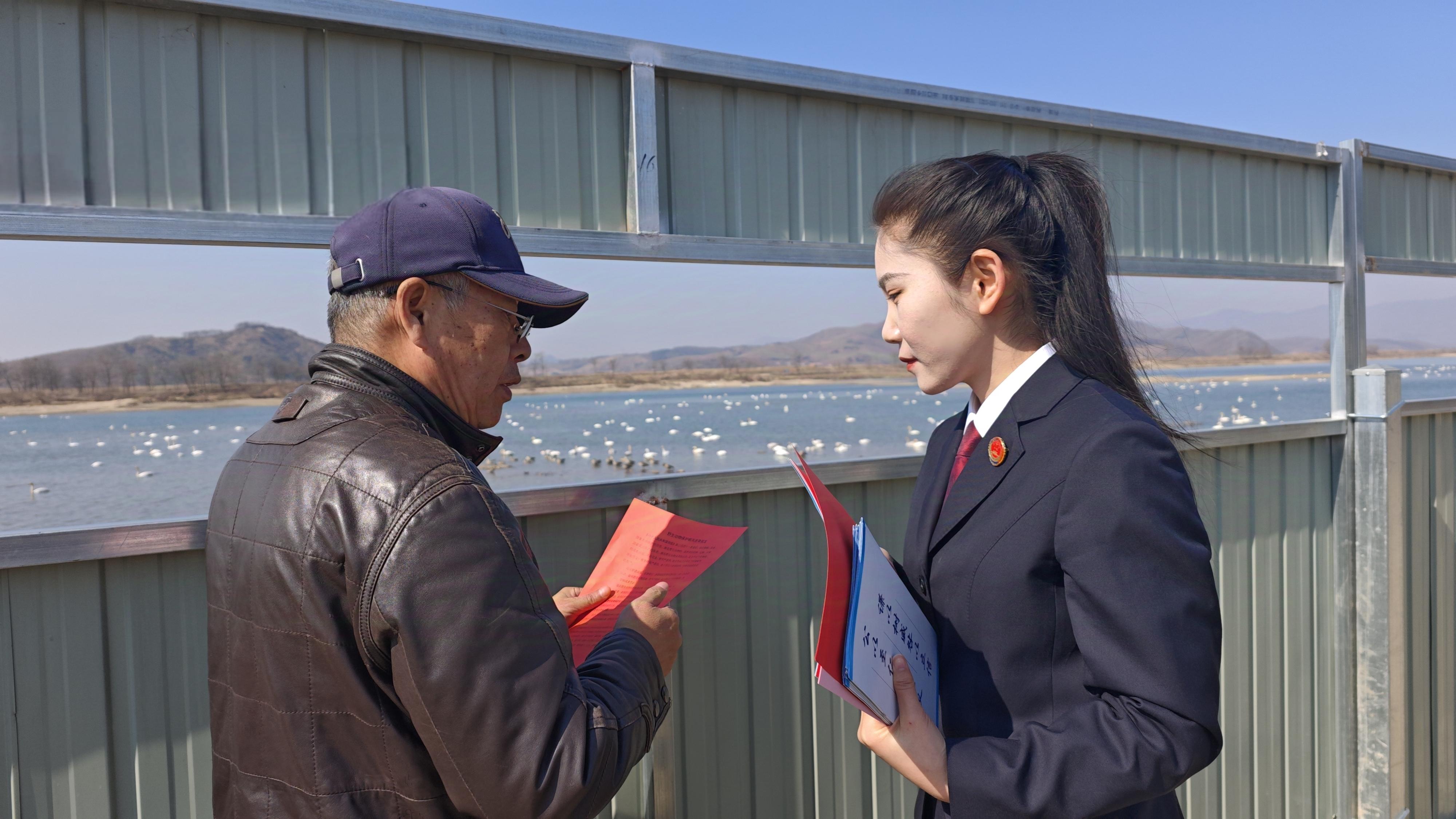 为了守护这些远道而来的“蓝天精灵”,凤城市人民检察院干警对观鸟群众开展野生动物保护普法宣传,发放《加强鸟类等野生动物保护倡议书》,提高群众对野生动物的保护意识,促进人与自然和谐共生。