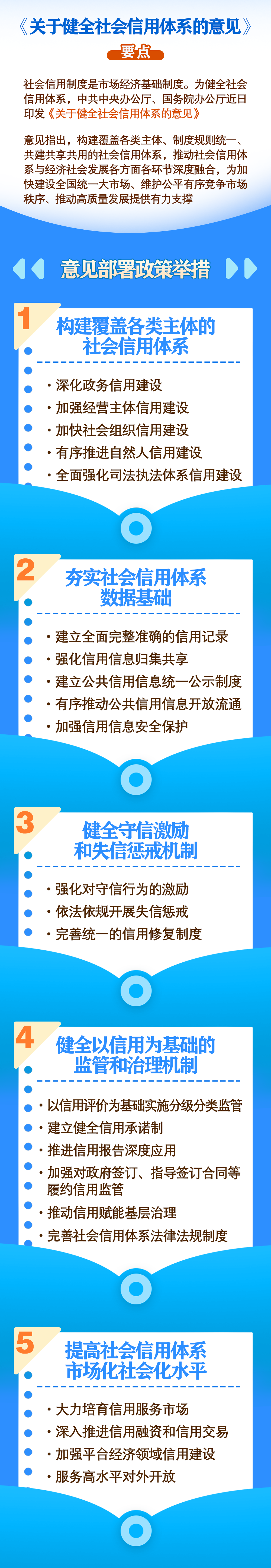 《意见》部署了五方面23项重点任务,包括构建覆盖各类主体的社会信用体系,夯实社会信用体系数据基础,健全守信激励和失信惩戒机制,健全以信用为基础的监管和治理机制,提高社会信用体系市场化社会化水平。