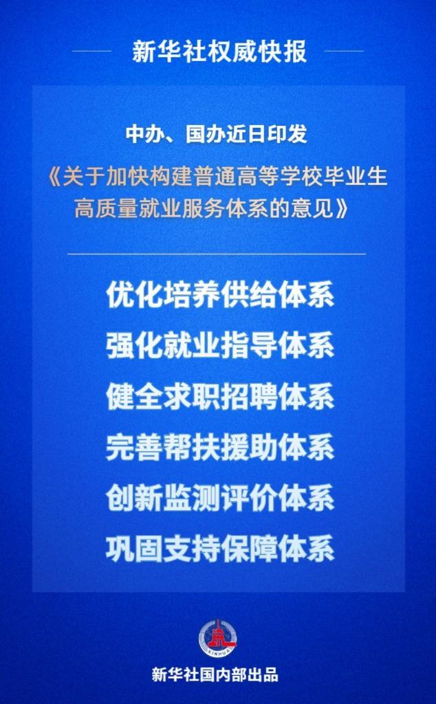 近日,中办、国办印发《关于加快构建普通高等学校毕业生高质量就业服务体系的意见》,对构建高质量就业服务体系、促进高校毕业生高质量充分就业有关工作作出部署。