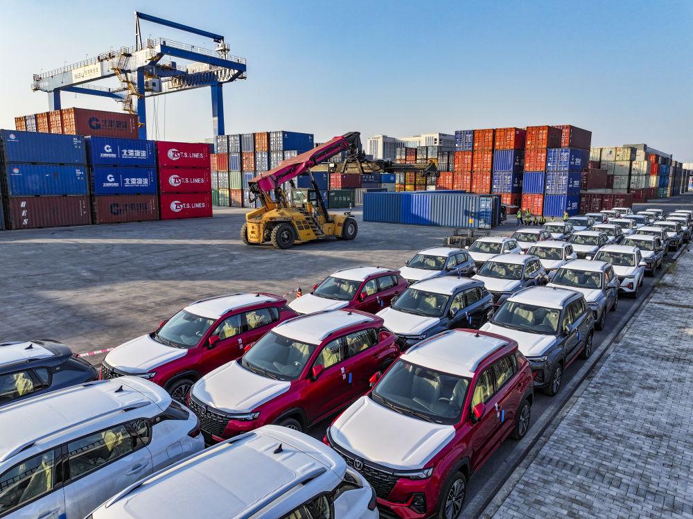 2024年10月28日在重庆国际物流枢纽园区西部陆海新通道重庆无水港拍摄的出口汽车装运现场(无人机照片)。位于重庆市沙坪坝区的重庆国际物流枢纽园区,是重庆中欧班列、西部陆海新通道班列、渝满俄班列、渝甬班列的主要到发点,截至2024年10月,已开通班列线路62条,辐射125个国家和地区的542个港口。