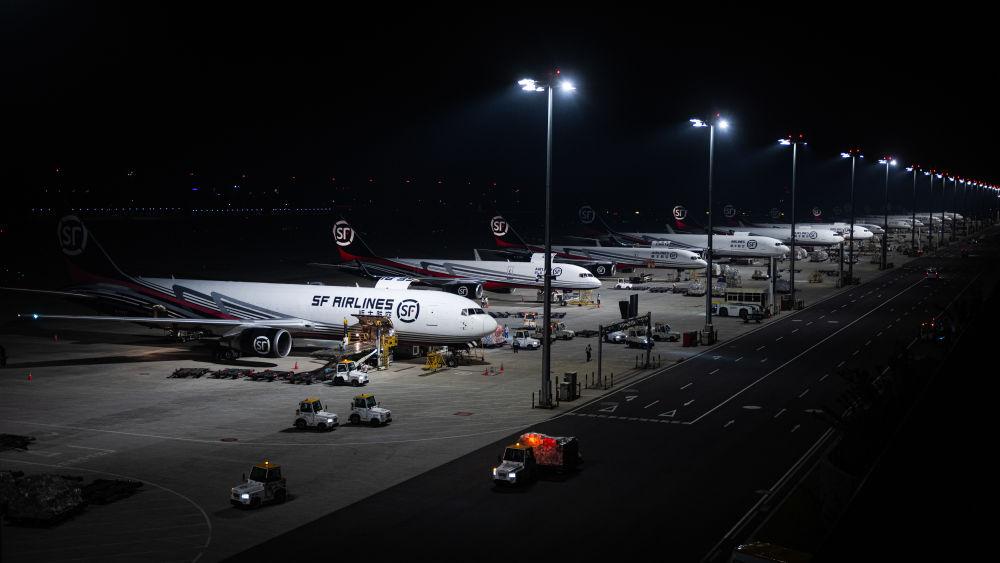 2024年5月25日凌晨,工人在湖北鄂州花湖国际机场停机坪装卸货物。鄂州花湖国际机场于2022年7月建成投运,是亚洲首个专业货运枢纽机场。截至2025年1月26日,鄂州花湖国际机场已开通37条国际货运航线和66条国内货运航线。