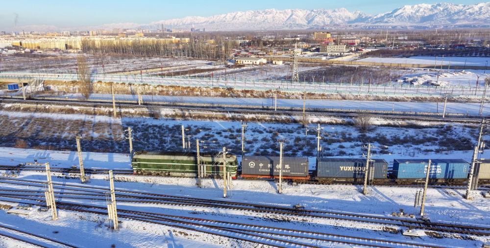 2024年12月25日,一列中欧班列经霍尔果斯口岸驶向哈萨克斯坦(无人机照片)。霍尔果斯口岸地处伊犁哈萨克自治州、毗邻哈萨克斯坦,是古丝绸之路北道上的千年驿站,也是近现代对外开放的百年口岸,更是我国面向中亚、西亚乃至欧洲的重要物流通道。2024年,该口岸中欧(中亚)班列开行量达8730列,同比增长12.5%;货物过货量达1208.4万吨,同比增长10.9%;通行班列线路总数超过80条,辐射境外18个国家的46个城市。