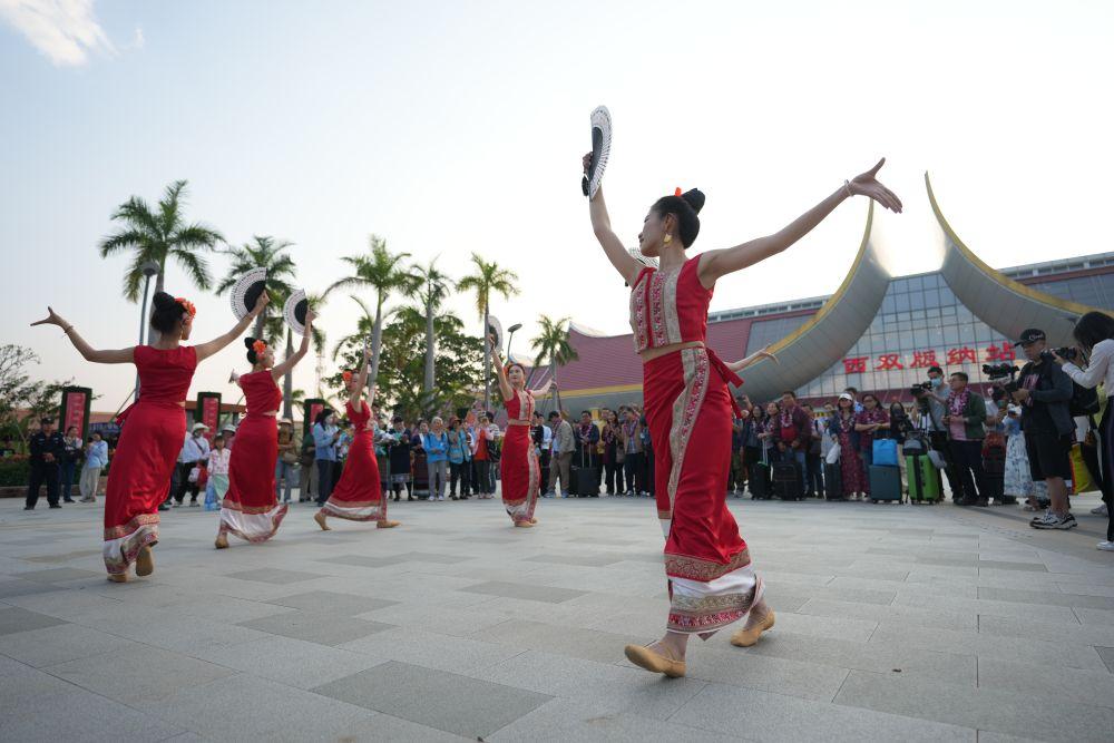 2025年2月18日,演员在中老铁路西双版纳站外为来自泰国和老挝的游客表演傣族舞蹈。当日,由15名老挝和泰国游客组成的旅游团从磨憨口岸入境后乘坐火车抵达云南省西双版纳傣族自治州景洪市。这是东盟国家旅游团入境云南省西双版纳傣族自治州免签政策实施后,抵达的首个旅游团。