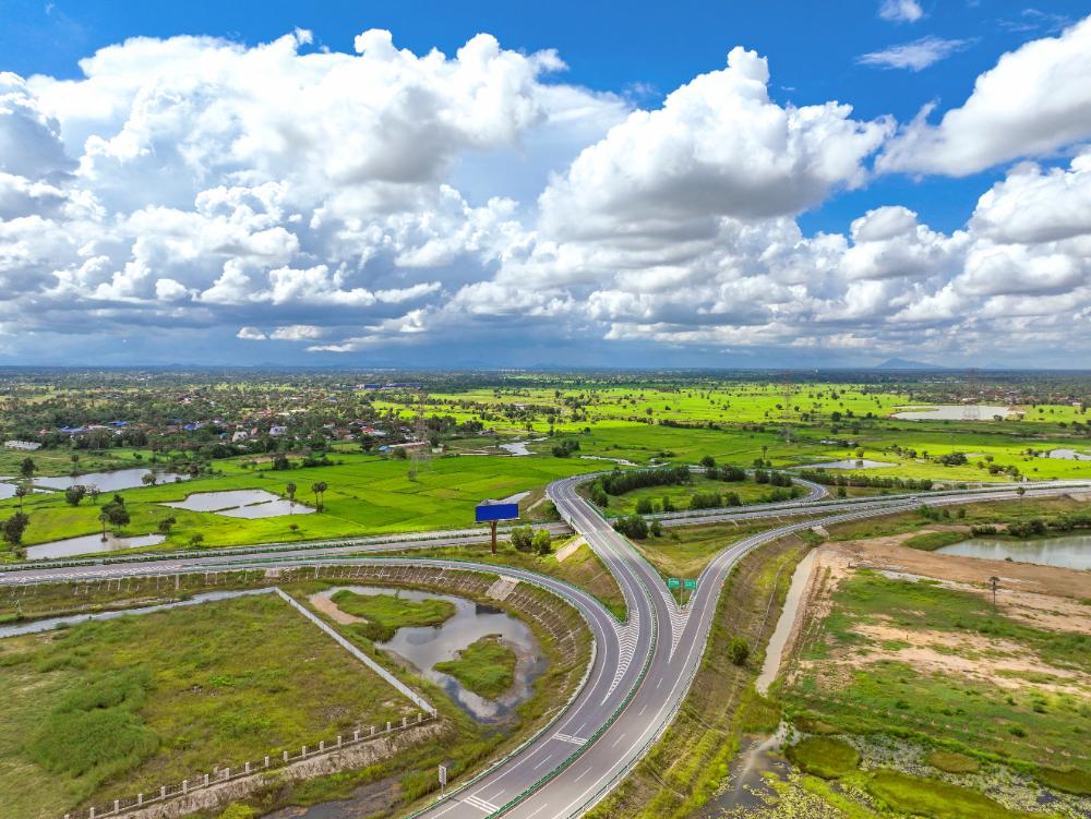 这是2024年9月25日在柬埔寨磅士卑省拍摄的金港高速公路(无人机照片)。金港高速公路是中国路桥工程有限责任公司(中国路桥)按“建造-运营-移交”模式投资的项目。新华社发(柬埔寨金港高速公路有限公司供图)
