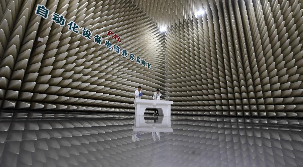 在南瑞集团有限公司自动化设备电磁兼容实验室,科研人员进行辐射发射实验准备工作(2023年7月7日摄)。新华社记者 季春鹏 摄