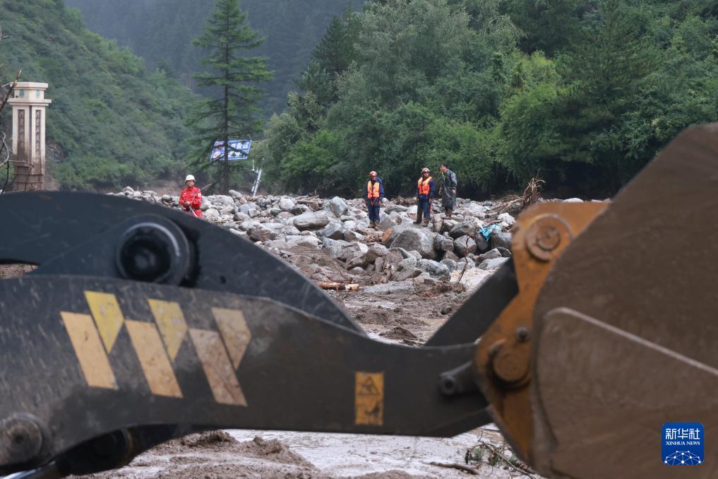 8月8日,救援人员在榆中县马坡乡山洪灾害现场排查险情,引导救援车辆进入。新华社发(金万贵摄)