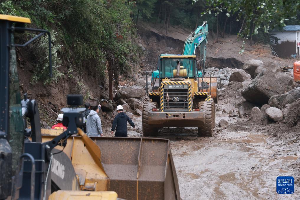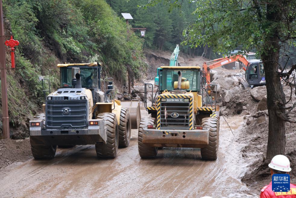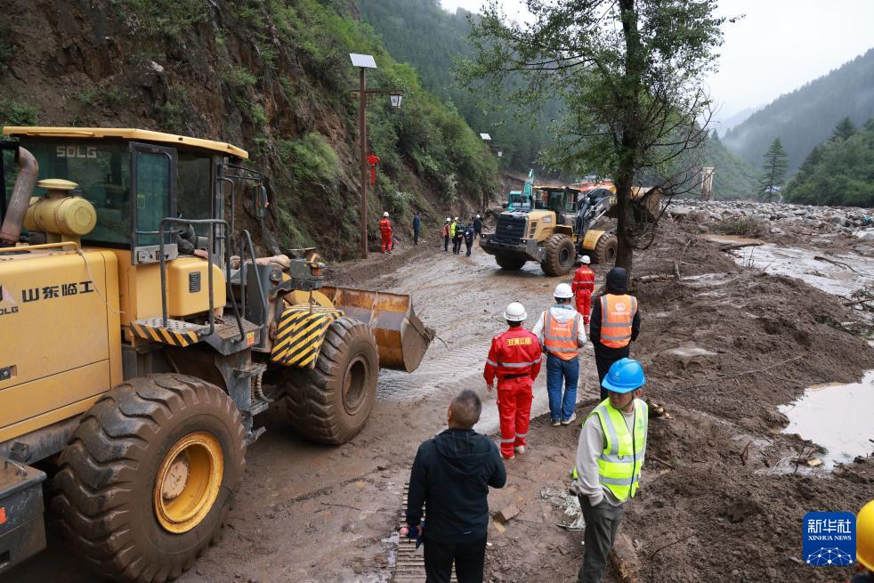 8月8日,救援人员在榆中县马坡乡山洪灾害现场抢修中断道路。新华社发(金万贵摄)