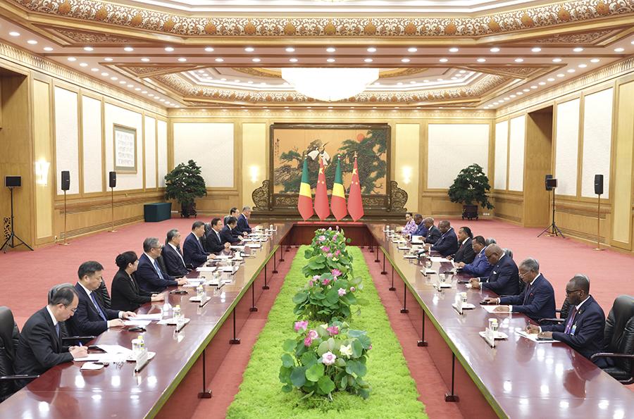 习近平强调,刚果(布)担任中非合作论坛非方共同主席国以来,同中方一道积极推动北京峰会成果落实,取得可喜成绩。中方愿同非方共同实施好“十大伙伴行动”,打造绿色产业、电子商务和支付、科技、人工智能等新增长点,推动中非合作提质升级。当前国际形势变乱交织,中国和非洲作为全球南方重要成员,要肩负起捍卫国际公平正义、维护世界和平、促进共同发展的历史责任,携手推动构建人类命运共同体。