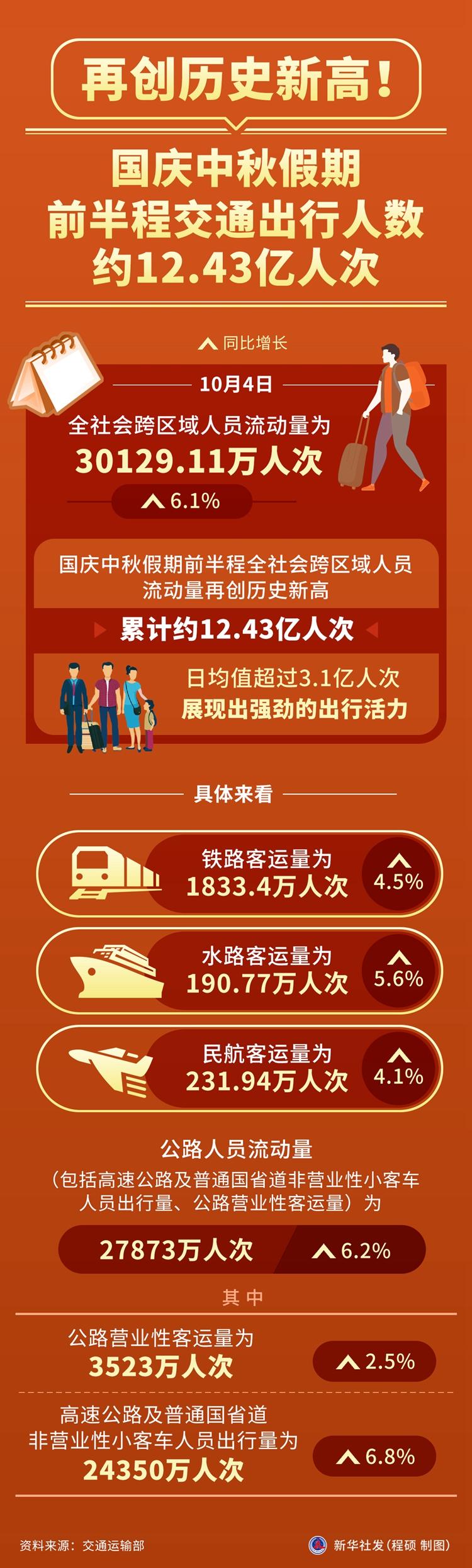 新华社北京10月5日电(记者叶昊鸣)记者5日从交通运输部获悉,10月4日,全社会跨区域人员流动量为30129.11万人次,同比增长6.1%。国庆中秋假期前半程全社会跨区域人员流动量再创历史新高,累计约12.43亿人次,日均值超过3.1亿人次,展现出强劲的出行活力。