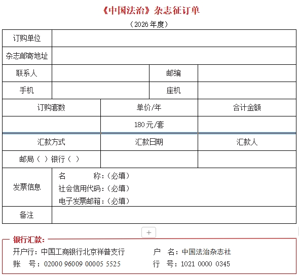 ③2025年7月起,“中国司法杂志社”更名为“中国法治杂志社”。银行户名于2025年8月25日变更,由“中国司法杂志社”变更为“中国法治杂志社”,开户银行、账号、行号均未变。