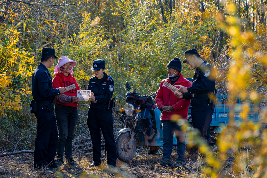 10月11日,乌鲁木齐铁路公安处石河子站派出所民警深入铁路沿线,在秋色中与转场牧民及周边居民谈收成、唠家常,宣传铁路安全与反诈知识,并提醒大家天干物燥注意安全用火用电,以防火灾风险,筑牢安全防线。