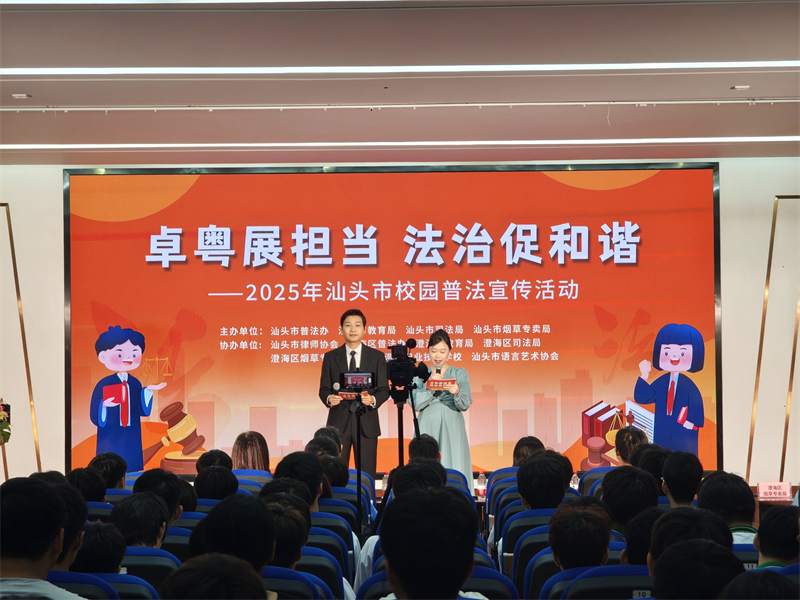 随后,汕头市烟草专卖局工作人员作《与法同行 守护青春》保护未成年人免受电子烟侵害的专题宣讲,通过以案释法,揭示电子烟对未成年人的危害,引导学生远离。潮语小品演员们上演的普法主题潮语小品《无法承受的冲动》则通过艺术形式传递法治观念,诙谐幽默的表演赢得满堂掌声。