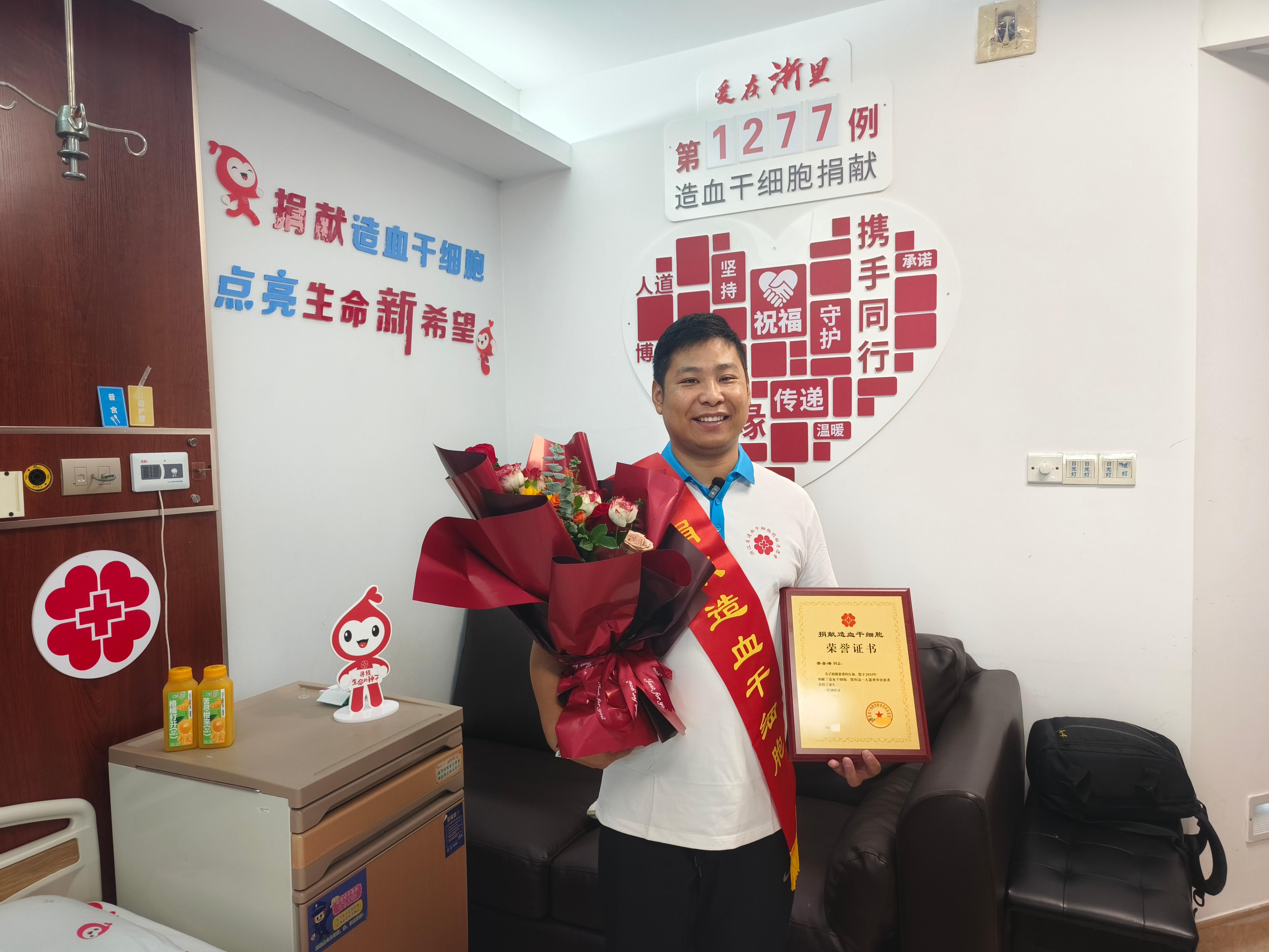 随着采集结束,李圣涛成为浙江省第1277例、丽水市第30例非血缘造血干细胞捐献者,他也是莲都区第三例捐献者。此次采集历时4个多小时,共分离出305毫升造血干细胞混悬液——这份“生命种子”,将为远方的患者带去新生希望。