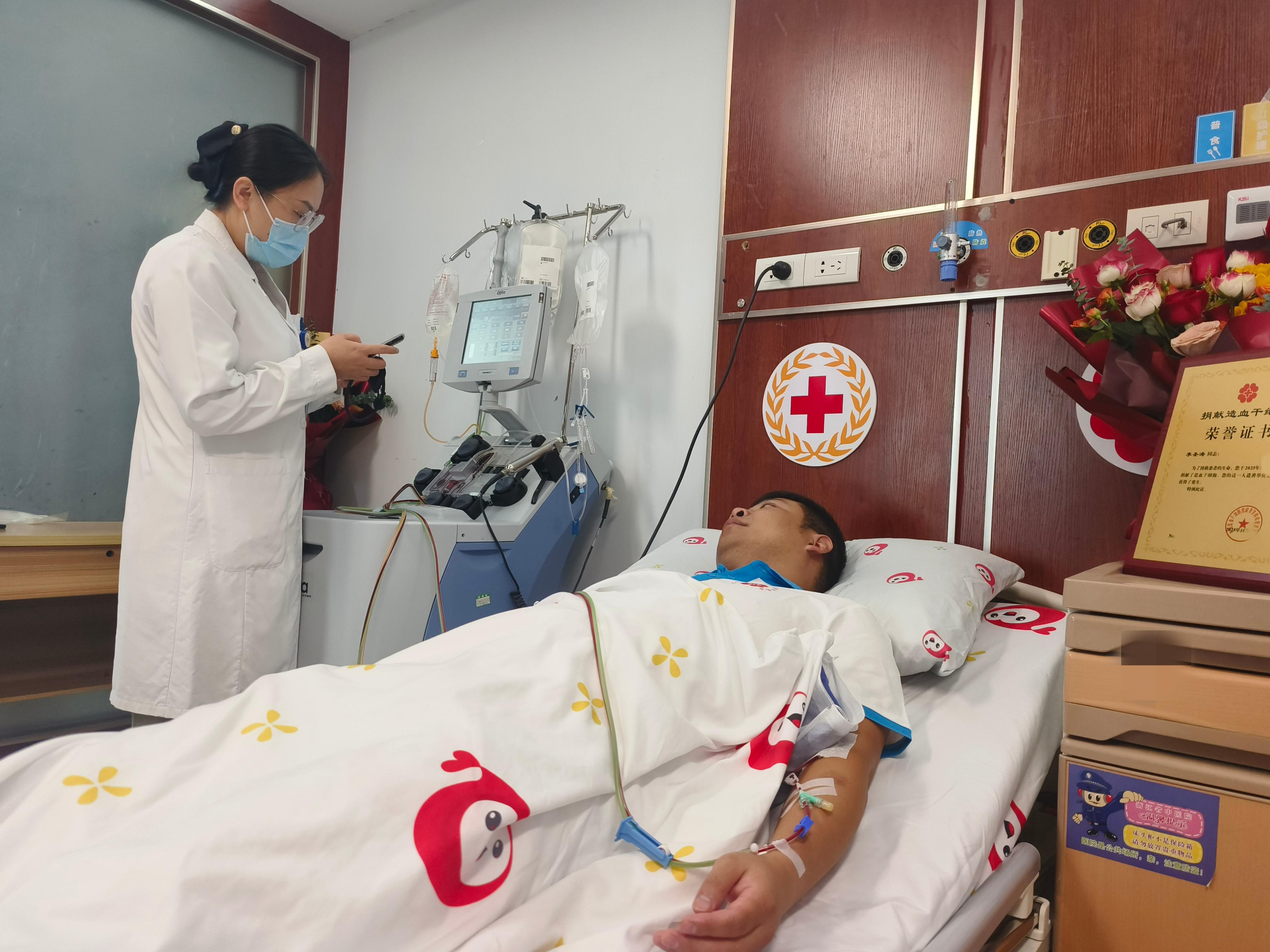 10月17日,杭州某医院的造血干细胞采集室内,31岁的丽水辅警李圣涛静静躺着,鲜红的血液在仪器管道中流淌。这一天,他完成了一场跨越距离的“生命接力”。