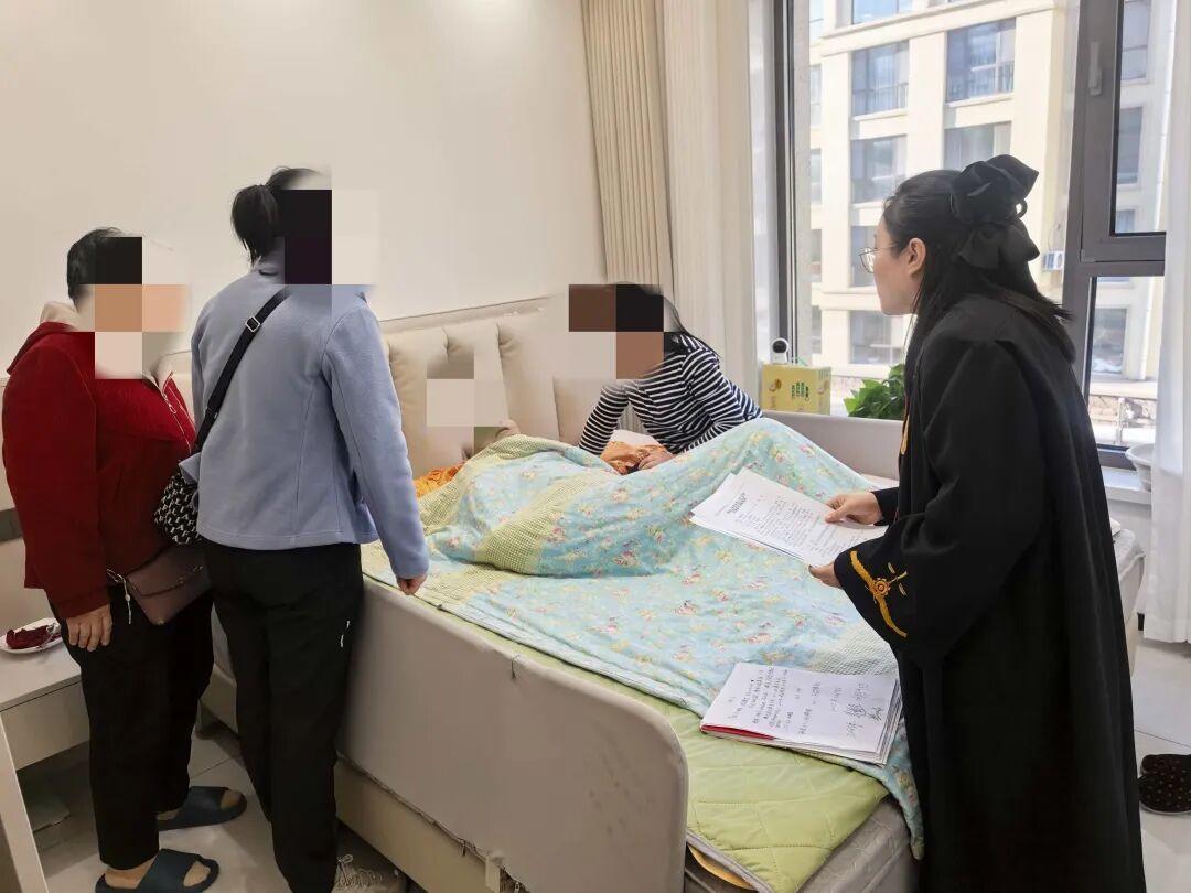 开庭当天,干警们一进老人家门,就忙着搭建临时法庭;法官没有用急促的问话推进流程,反而把语速放慢了两倍,拉着老人的手耐心倾听——这份“把当事人当家人”的细致,渐渐融化了老两口心中的芥蒂,让他们愿意敞开心扉沟通。调解结束后,法官特意蹲在张爷爷的病床边叮嘱:“后续的法律文书我们会直接送过来,您和阿姨要是有任何疑问,随时给我们打电话,不用来回跑法院。”听到这话,张爷爷看着干警们收拾东西的背影,眼睛里泛起了泪光,他轻轻吐出两个字:“谢谢”。