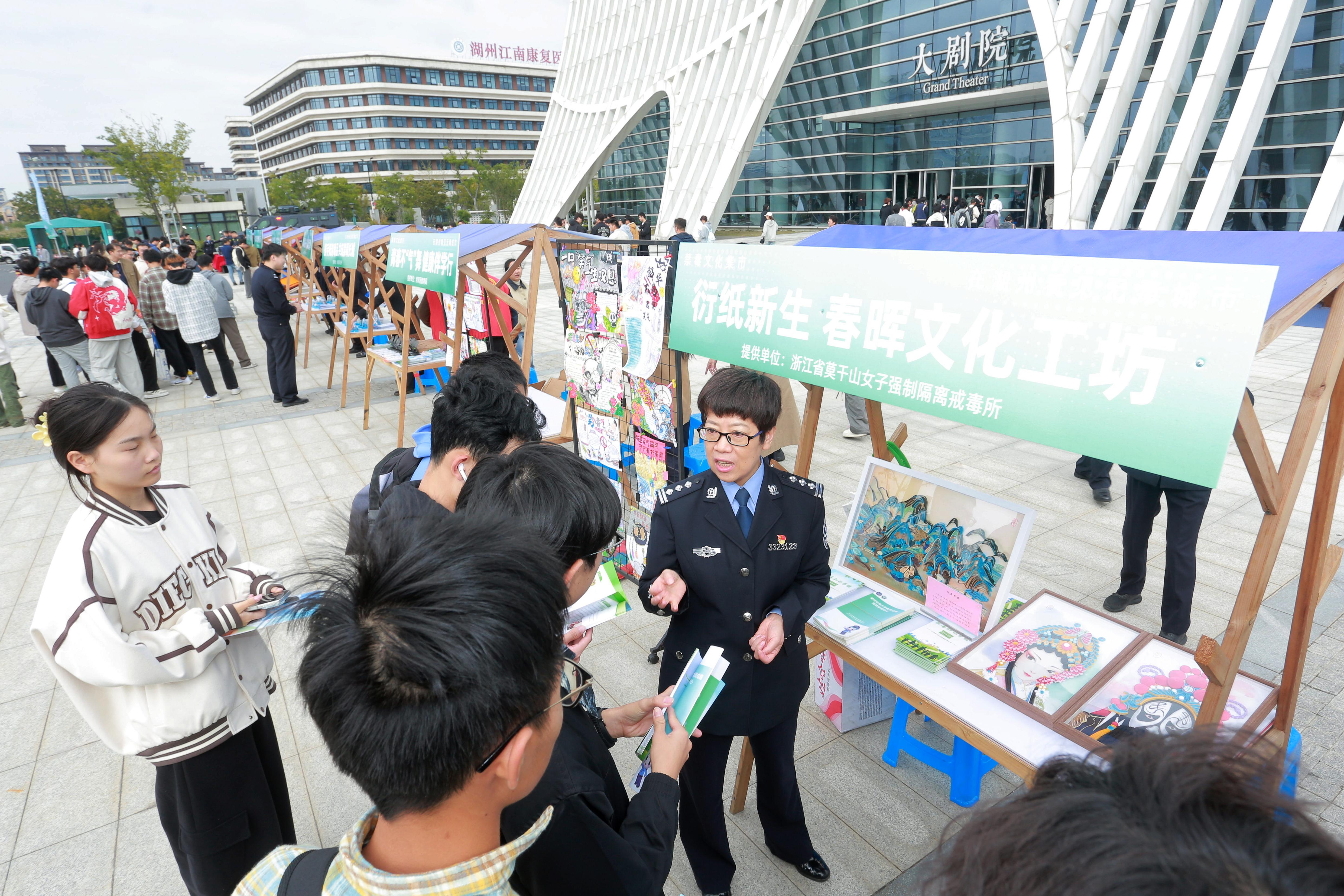 当天,浙江水利水电学院大剧院前广场的禁毒市集率先“开市”,巨型魔方禁毒logo醒目亮眼,创客大赛获奖作品集中展出;市公安局特警支队的缉毒犬现场表演“识毒绝技”,灵敏嗅觉引得师生阵阵惊叹;“机器狗寻毒”演示展现科技禁毒新力量,南浔公安分局特警装备与防暴车展示更让师生直观感受禁毒执法硬实力。此外,湖州市南浔区公安分局、检察院、法院、教育局、司法局等十余个禁毒职能部门设摊宣传,通过“笑气”模型展示、知识折页发放、互动答疑等形式,将“笑气”危害与防范知识传递给每一位参与者。