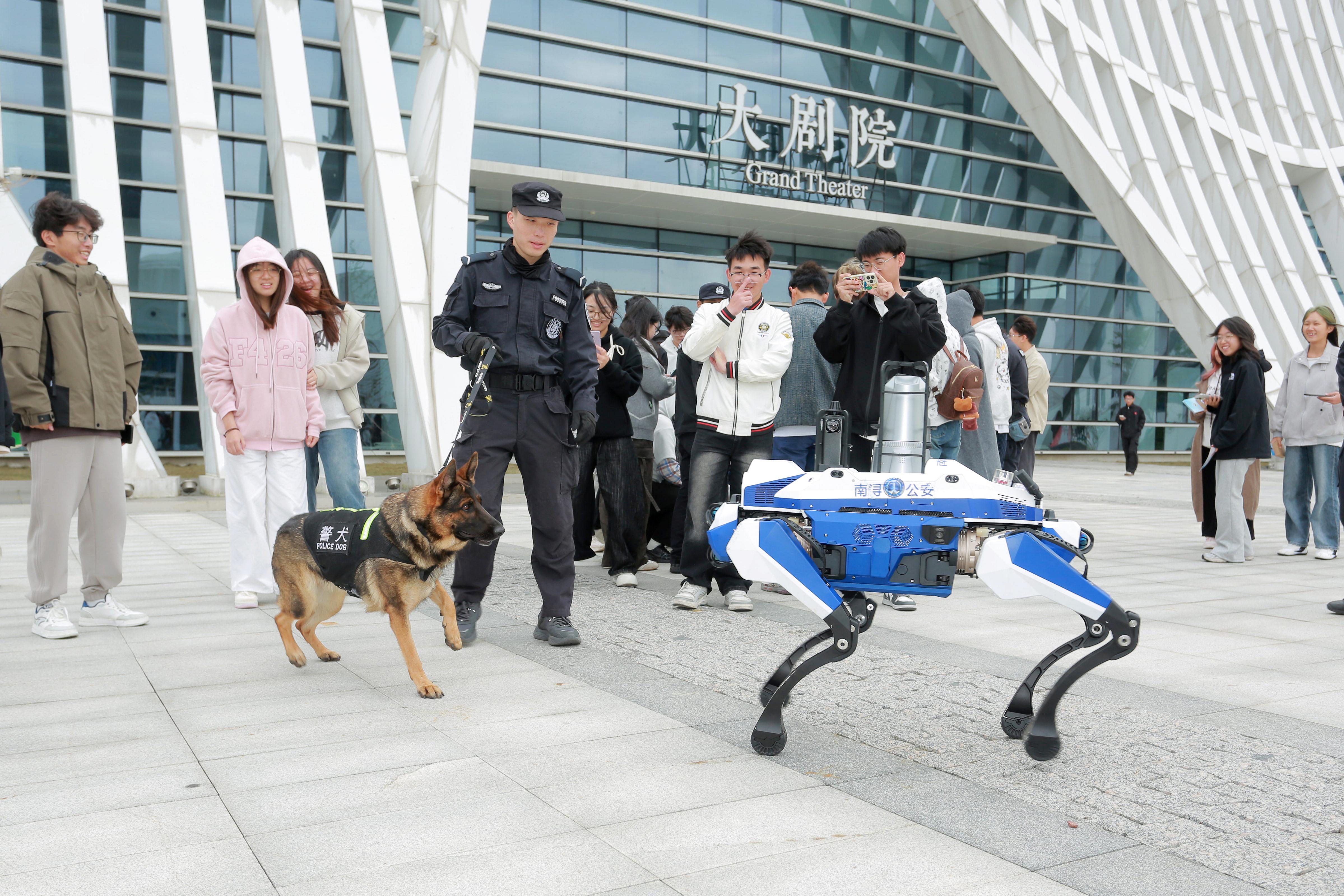 学生小王说:“第一次近距离看到缉毒犬和机器狗,感觉特别震撼!缉毒犬特别灵敏,驯导员刚把藏了模拟毒品的箱子摆好,它立马就闻着味儿凑过去,尾巴还轻轻晃,又专业又可爱;机器狗更让我眼前一亮,它能灵活穿梭在市集的桌椅之间,摄像头实时传输画面,还能根据指令停下来‘检查’,科技感满满。”