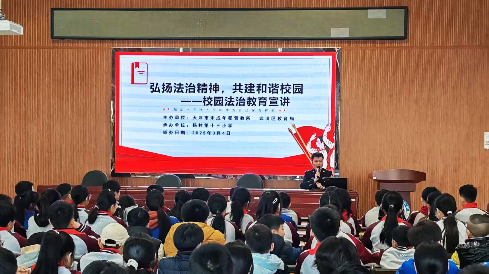 图为监狱民警在武清区杨村第十三小学开展“弘扬法治精神,共建和谐校园”法治教育宣讲。